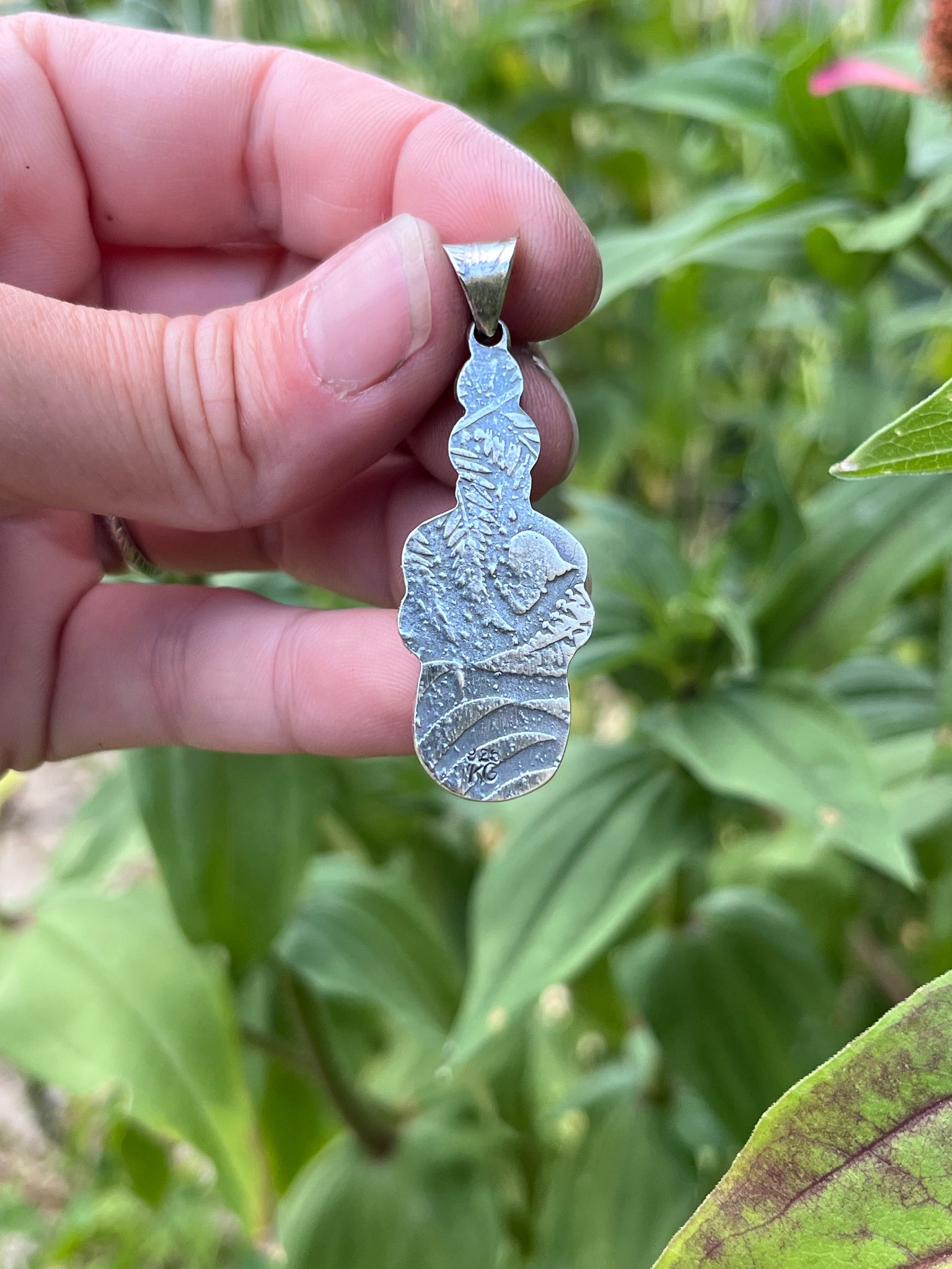 All solid handcrafted and hand pressed sterling silver pendant. Leafing impressions around base stone and shell crown at the top of setting all come from antique replicated impressions I hand press in my home studio. Backside and bail have fern like leafing detailing.