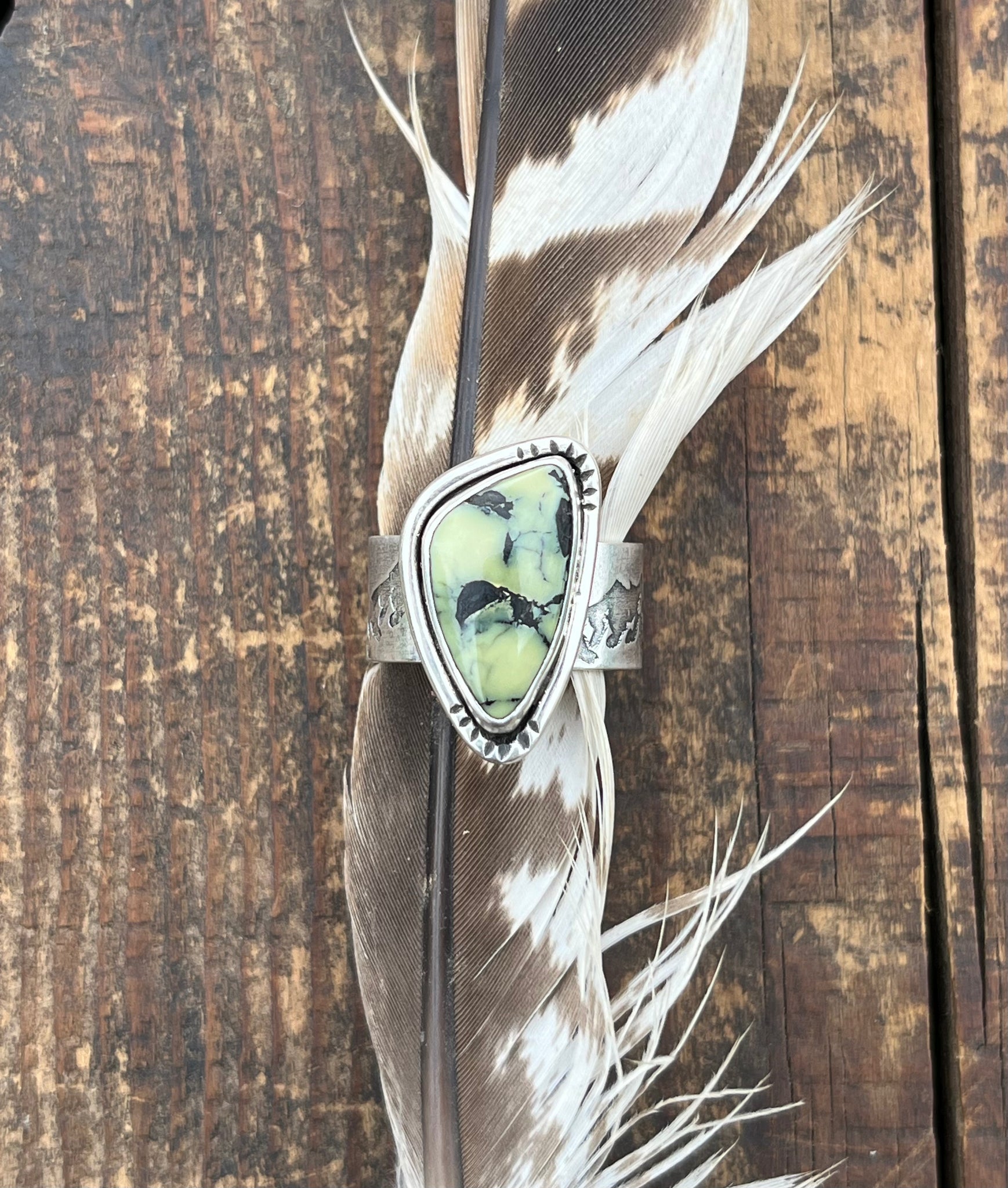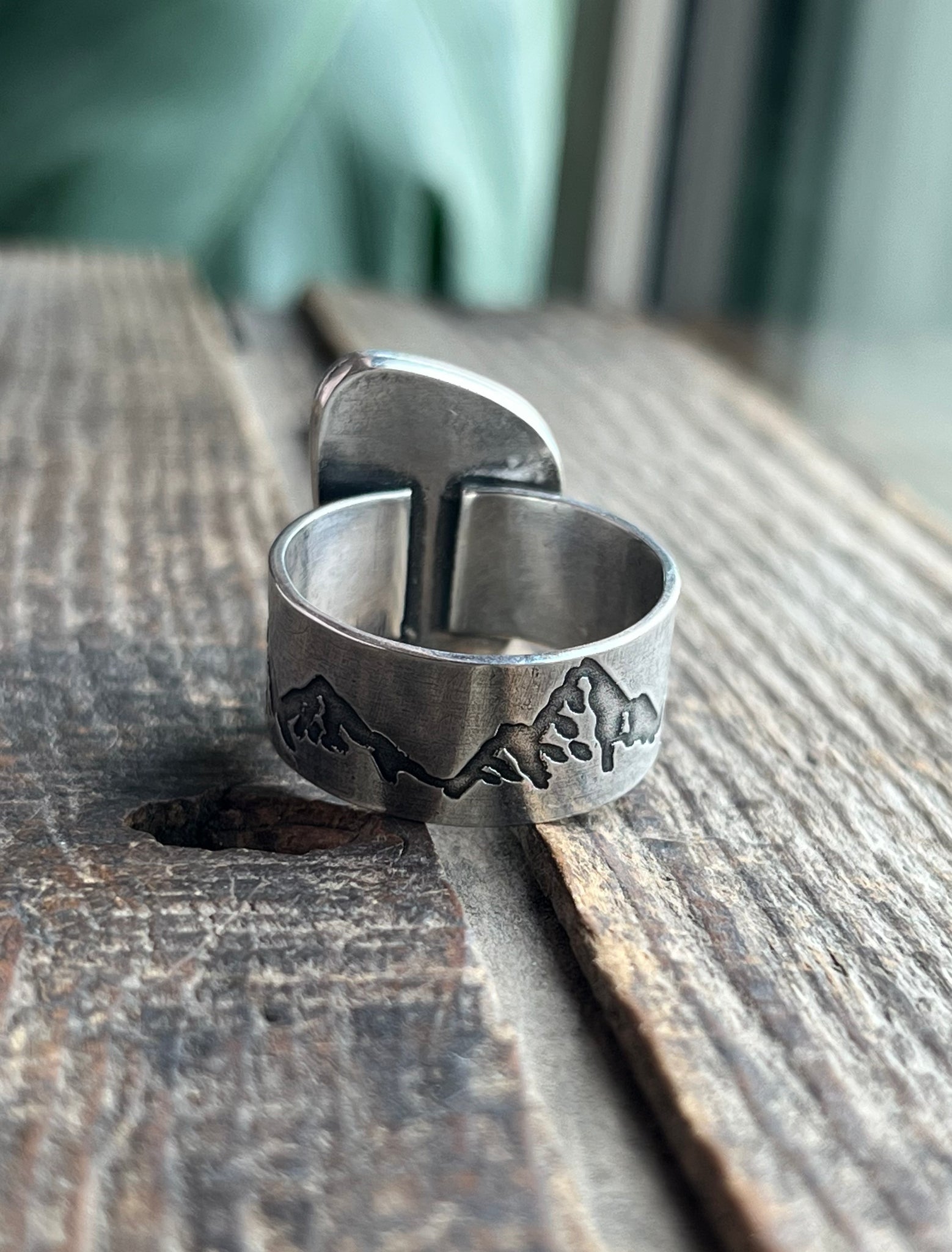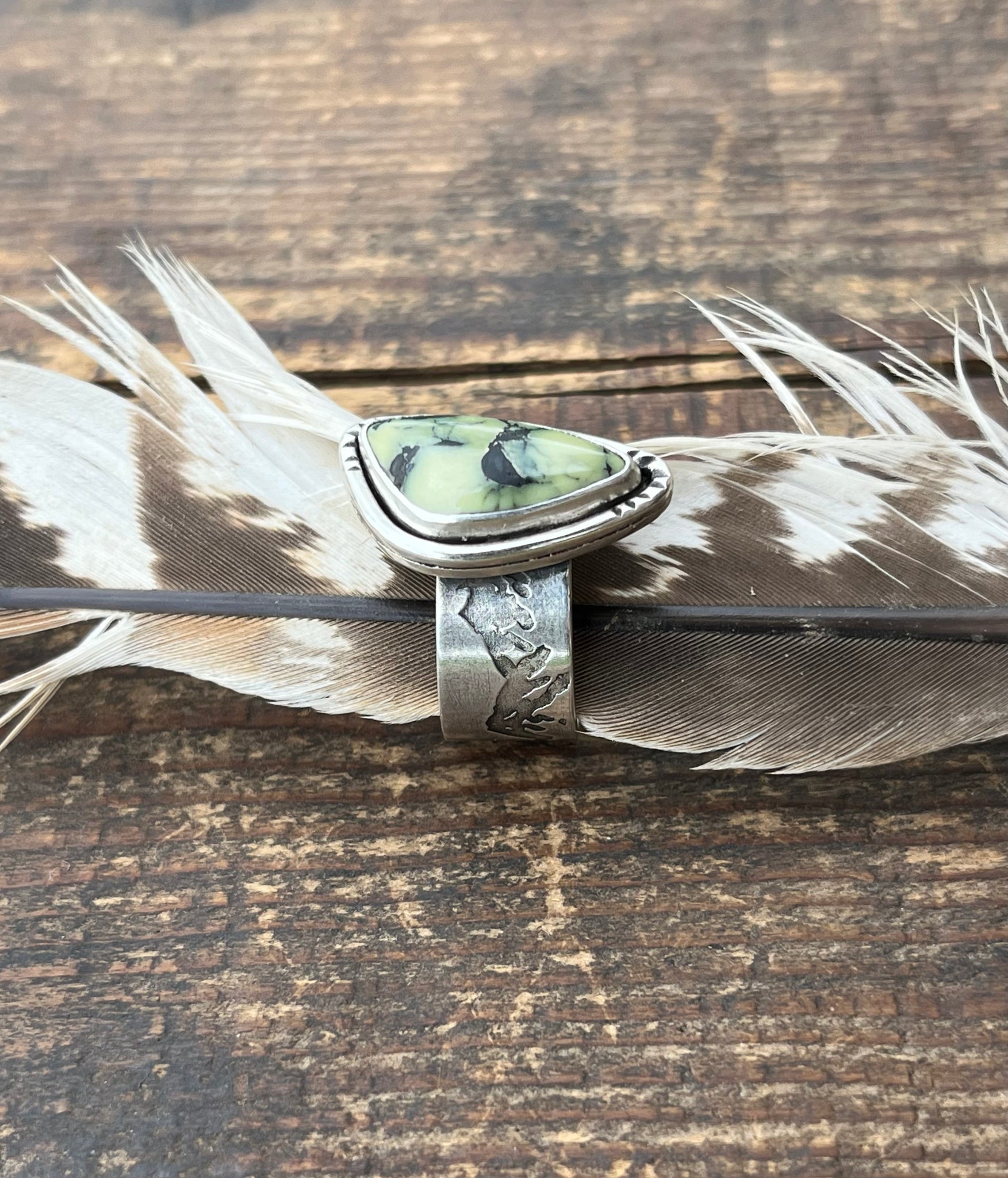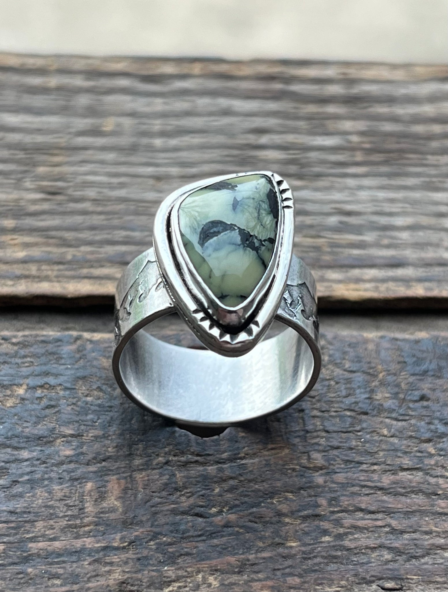 All solid handcrafted sterling silver ring with a wide mountain themed band. Stone is a natural cut of gemmy olive green with black chert veining Colina Verde Variscite (Nevada). This and many more loose stones I have available come direct from the miner Ryan.