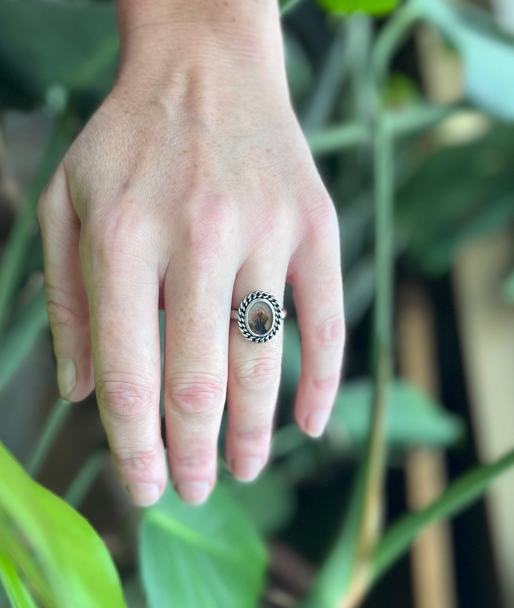 Gorgeously detailed dendritic picture agate in sterling silver ring with curb chain detailing.