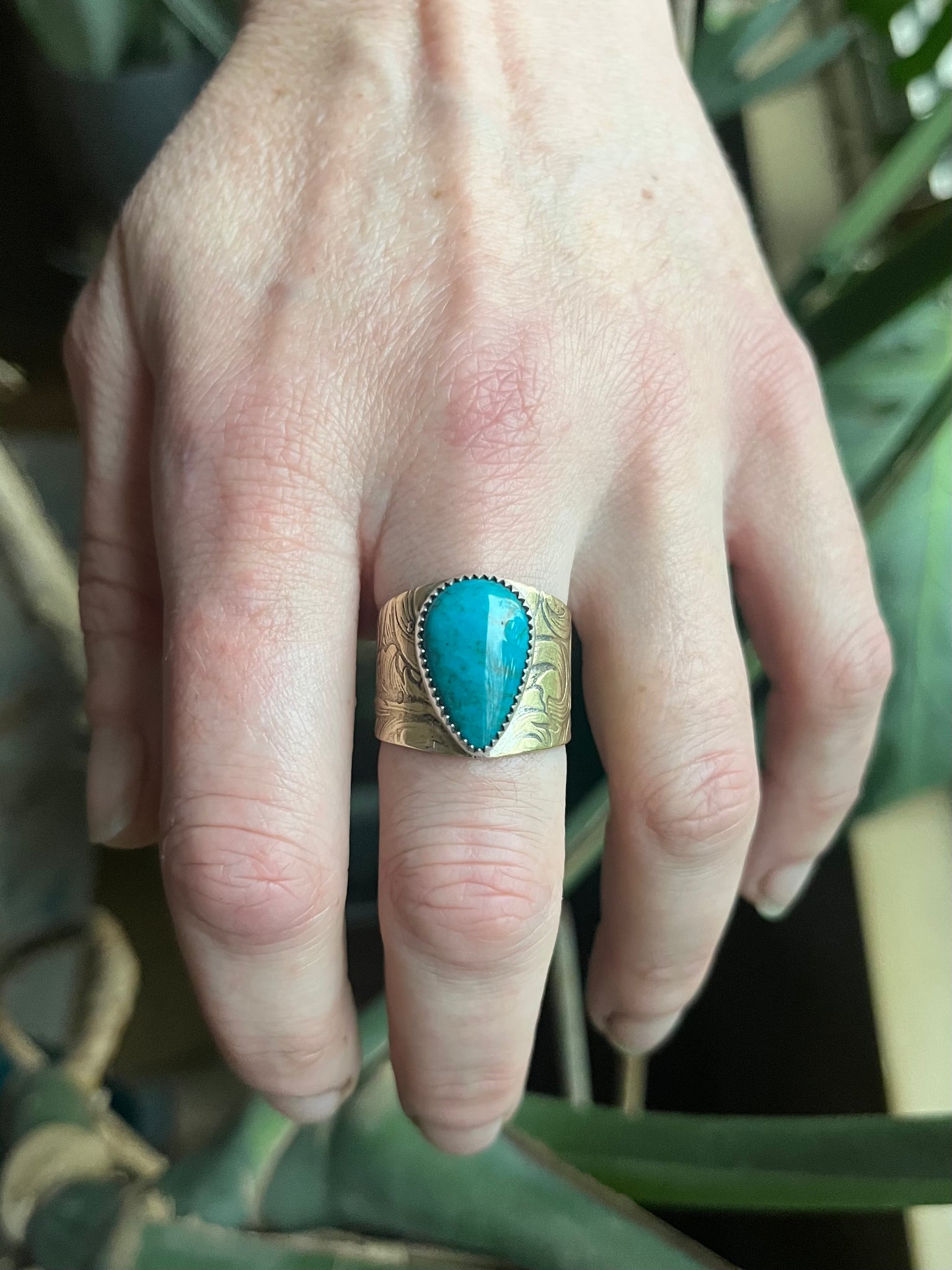 Western styled brass ring with a nice gemmy chunk of natural American turquoise.