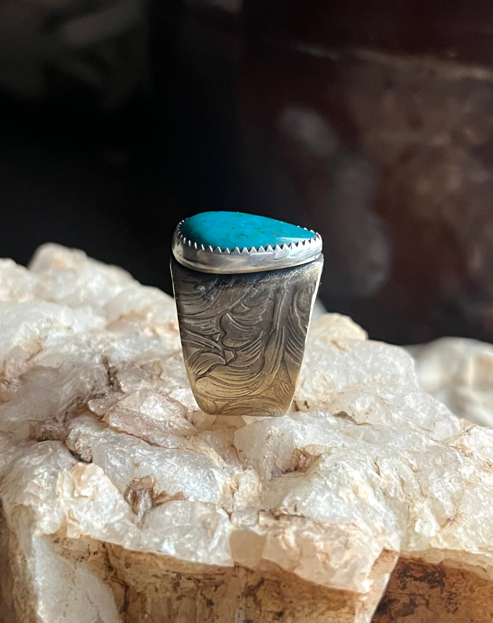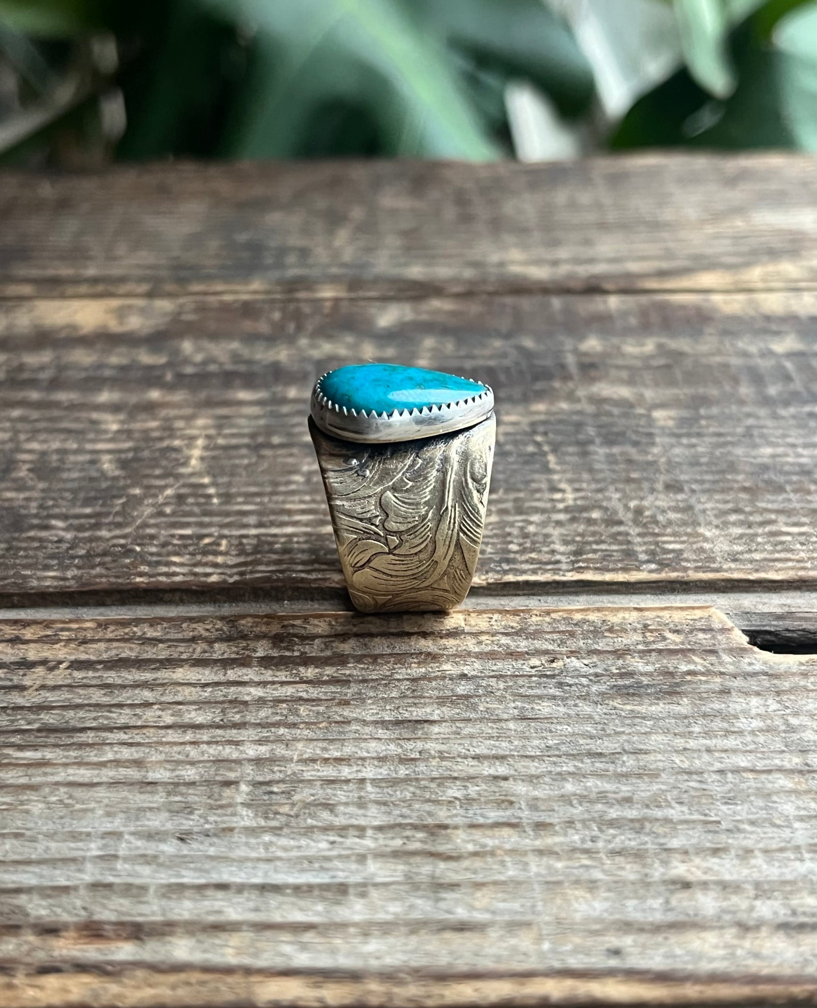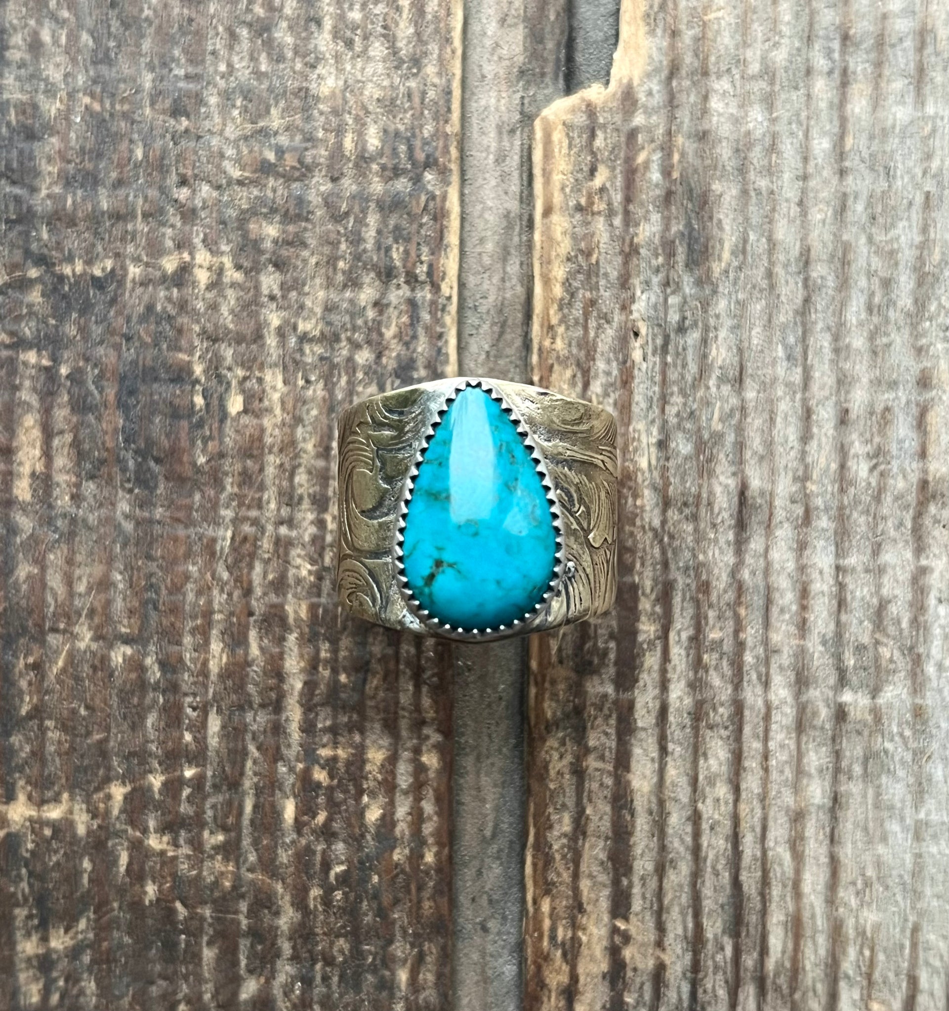 Band has a scrollwork style pattern for a western styling, top is 1” wide and tapers down to 1/2” at ring base.