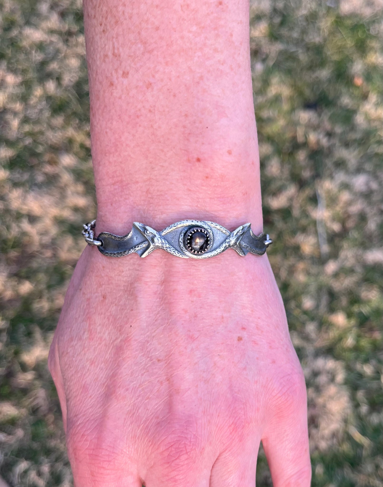 Striking pair of entwined serpents set with a nice silvery flash black Sunstone in handcrafted sterling silver bracelet.