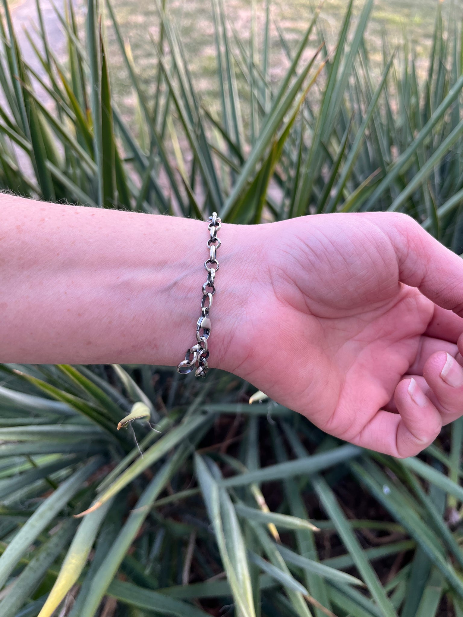 Bracelet sides are all handmade oval/circle links, all in solid sterling and soldered closed. Total length is 7.5” but can easily be adjusted down on chain for a tighter fit. If you would require a few less of additional link, please leave a comment at checkout for me to adjust before mailing.