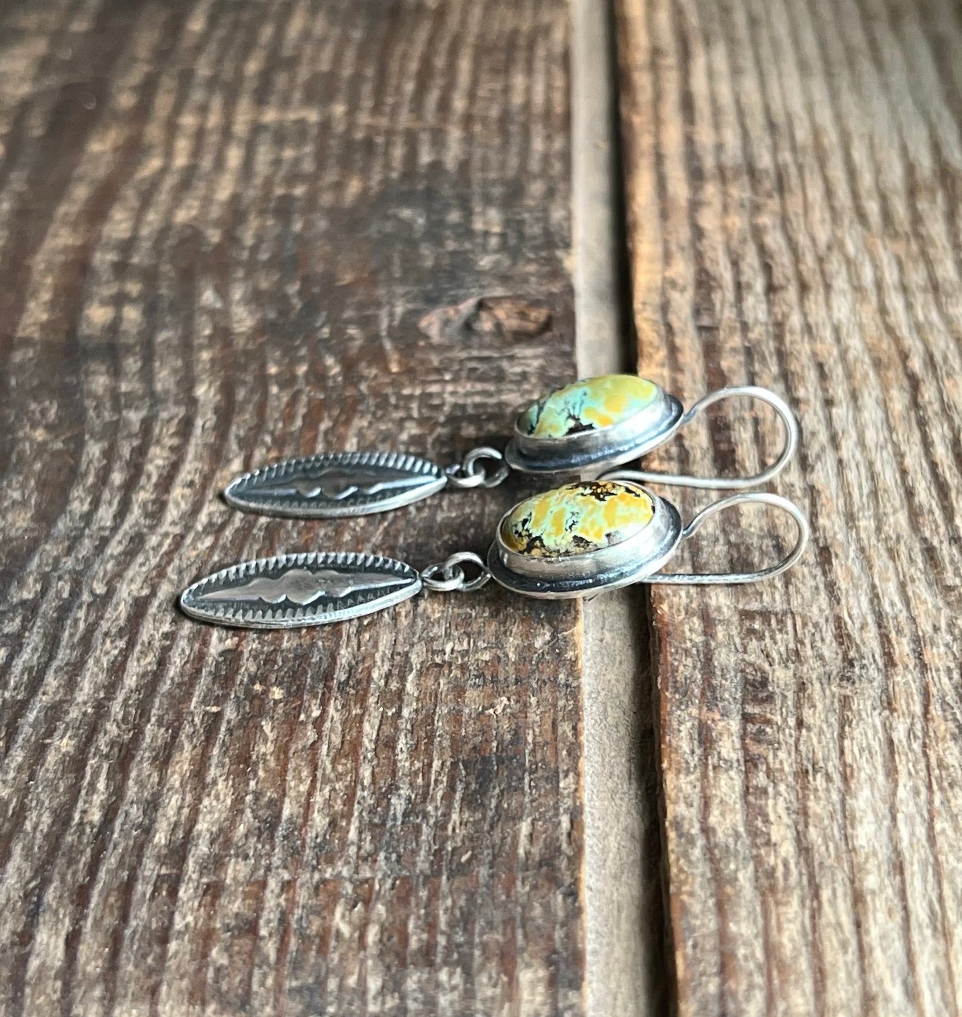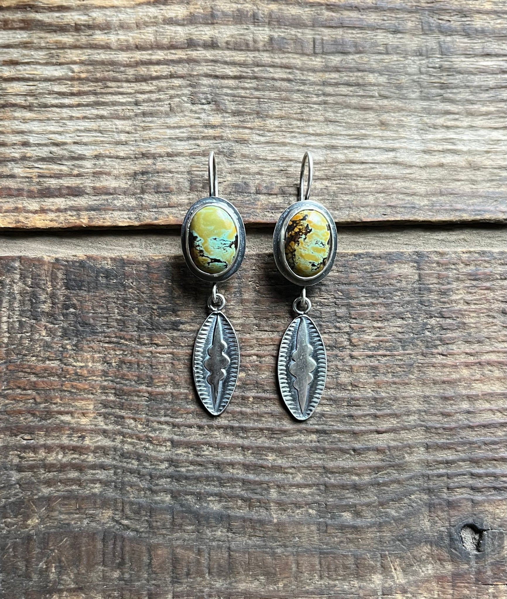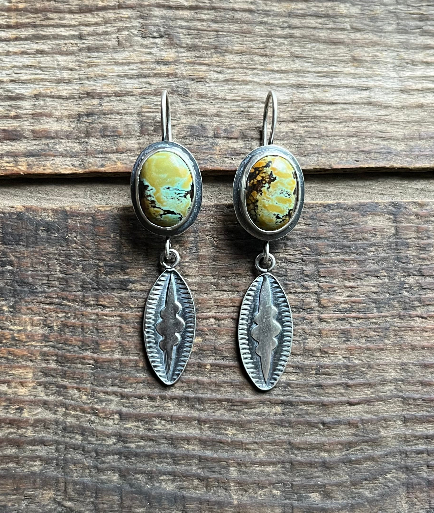 Edgy polychrome hued Blackjack turquoise in handcrafted sterling silver drop earrings with hand stamped western themed drops.
