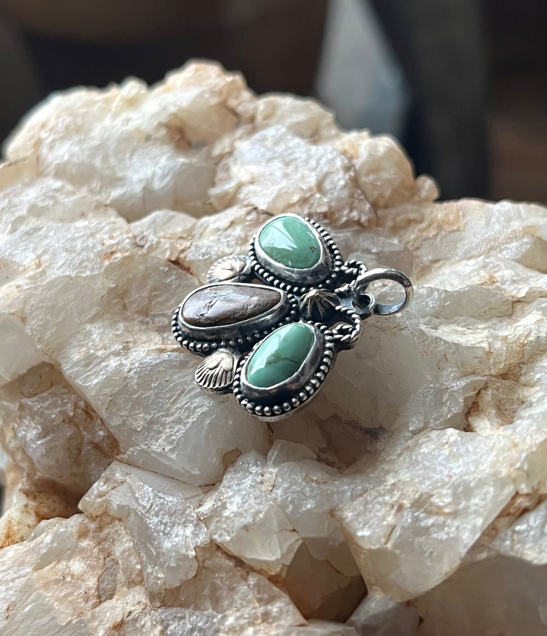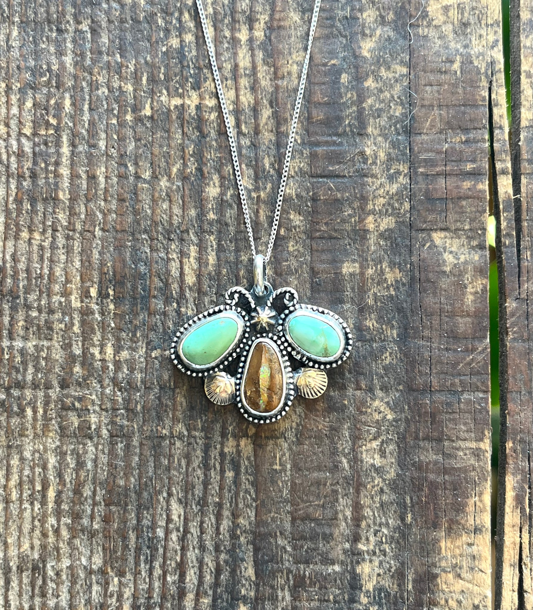 Stones are two pale green Kings Manassa turquoise and at center is a sparkly veined cut of Australian Crystal Pipe Opal.